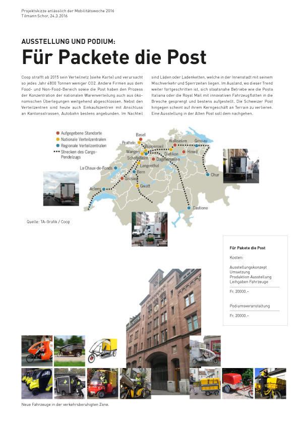 Konzeptidee einer Ausstellung/Podium in der Hauptpost zum Thema Citylogistik in der verkehrsberuhigten Kernzone von Basel