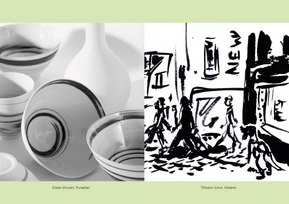 Tilmann Schor, mit schnellen, sicheren Pinselstrichen festgehaltene Strassenszenen, Tusche auf Papier / Acryl auf Leinwand und Dieter Ehrsam, handgedrehte Porzellan-Unikate. Gebrauchskeramik aus hochwertigem Audrey Blackman Porzellan.